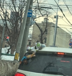 移動中、目の前の車についてた