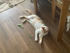 写真は最近買ってあげたおもちゃで遊びすぎてバテて伸びてる猫?